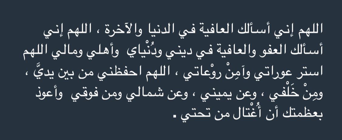 فى واحة القرآن والسنة اللهم انى اسالك العافية فى الدنيا والآخرة اللهم انى اسالك العفو والعافية في دينى ودنياي وأهلي ومالي اللهم استر عوراتى وآمن روعاتى اللهم احفظنى من بين يدي